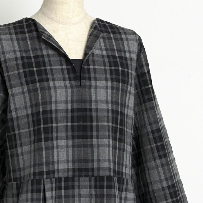縦横にサッカーの入った平織りの先染めチェック生地です。凹凸があり肌触りの良いサッカーですが、少し厚みのある生地なので暑い秋にもさらりと着られます。長く着られるグレーのワントーンカラーです。ワンピースやスカートにおすすめです。