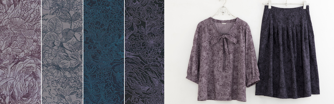 しなやかなビエラ地に線画の花柄をプリント。 風合いや着心地にこだわった新しいファブリックをコーディネートしやすいデザインでご紹介します。