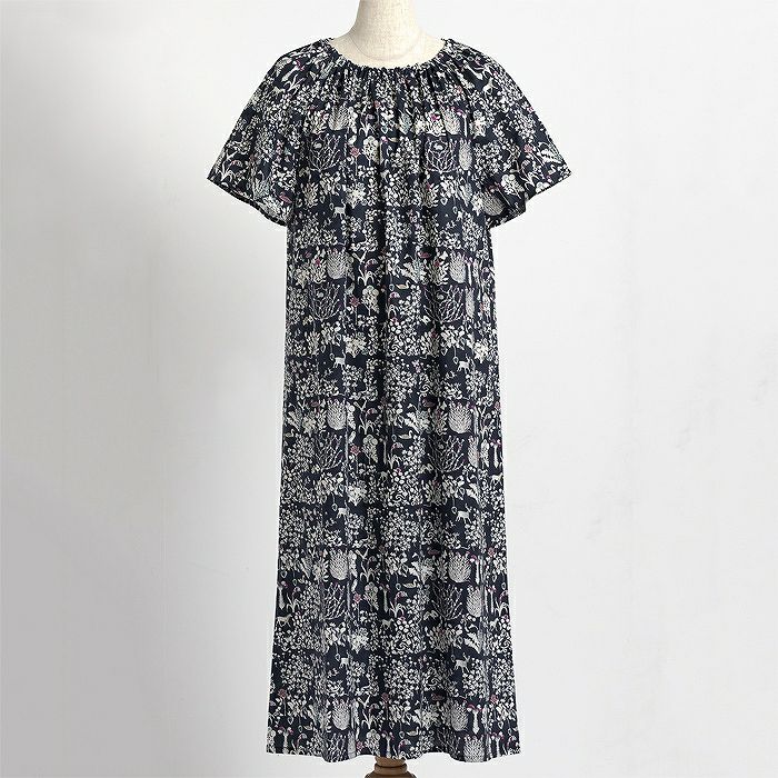 2010年秋冬コレクションの柄で、アーティスト渡邉良重とのコラボレーションにより生まれたデザインです。イラスト調の手描きの柄で、色地に地型染めを施した凸凹感のあるベースに、繊細なカンバセーショナル柄を驚くような線づかいで描いている。渡邊さんが得意とするメルヘン調のタッチにリバティプリントの重厚感が合わさったデザインになっています。