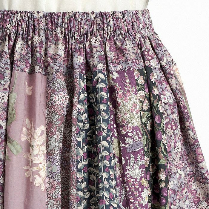 縦長にカットした生地を12柄セットしたカットクロスセットをつかってつくる、スカートの材料セットです。グレー、ワイン系のカラーリングでまとめました。リバティプリント ソープ・ヒルとゴムベルト、説明書がセットになっています。