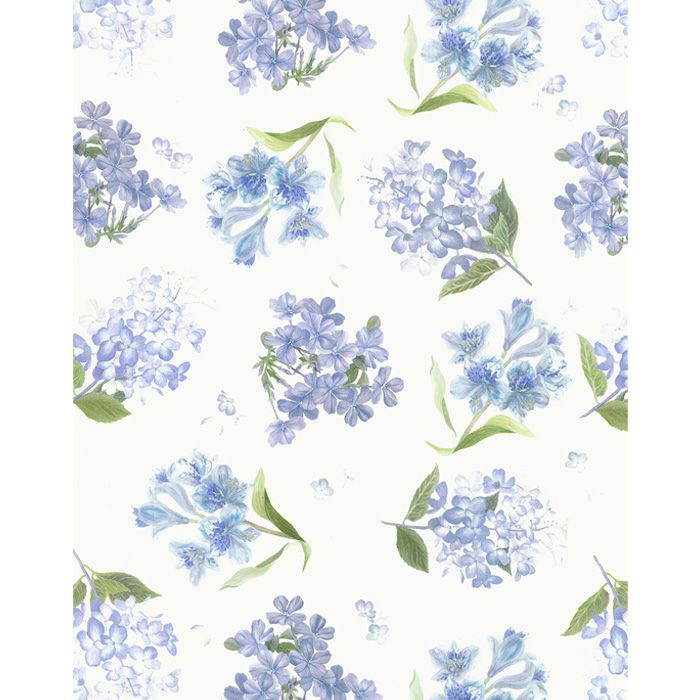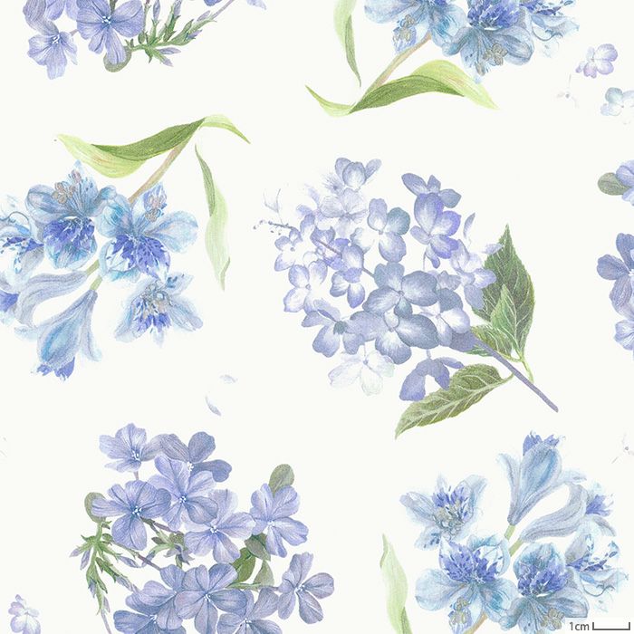「マリナズ・ウォーク」の姉妹柄です。素晴らしい細密なボタニカル・イラストが一堂に集められたデザインで、生地全体に多方向に広がるように優しく散りばめられたアジサイ、アルストロメリア、ブルー・ジャスミンが、精緻に描かれた浮かぶ小枝のように、まるで交響曲のように調和しています。