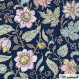 こちらの生地は、眺めているだけでもステキだと思っていましたが、鏡の前で、顔にあてると自分の顔がワンランクアップして見えるような、とても上品に見える柄です。絶妙な、ニュアンスカラーがホビーラさんらしい色合いです。ぜひおすすめしたい柄の一つです。 ネイビーの地色が、花々の美しさをよりいっそうひきたてています。