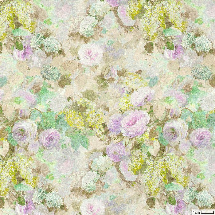 アーカイブの手描き作品を再構成したデザインで、紫陽花、ライラック、バラの花束が滝のように流れ落ちるロマンチックな花柄です。優美な植物の形の中で光と影が戯れ、優しいイルミネーションとほのかな朝の霧のような効果を生み出します。
