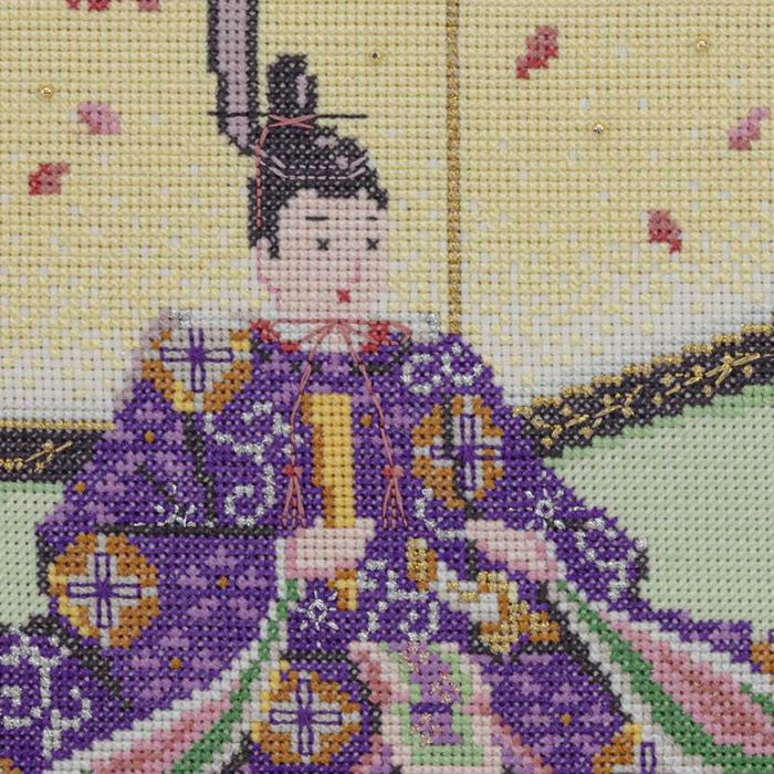 格調高い平安貴族の装束を身につけた内裏雛の衣の織り模様や衣の重なりなど、細部まで丁寧に刺し上げます。ラメ糸やトッピングでより豪華な仕上がりに。