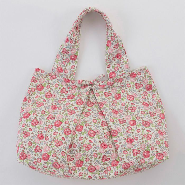適度な厚みと織り模様のあるソフトへリンボン地のリバティプリント〈フェリシテ〉でつくる、収納力のある大きめバッグ。側面のタックがアクセントのデイリーバッグです。