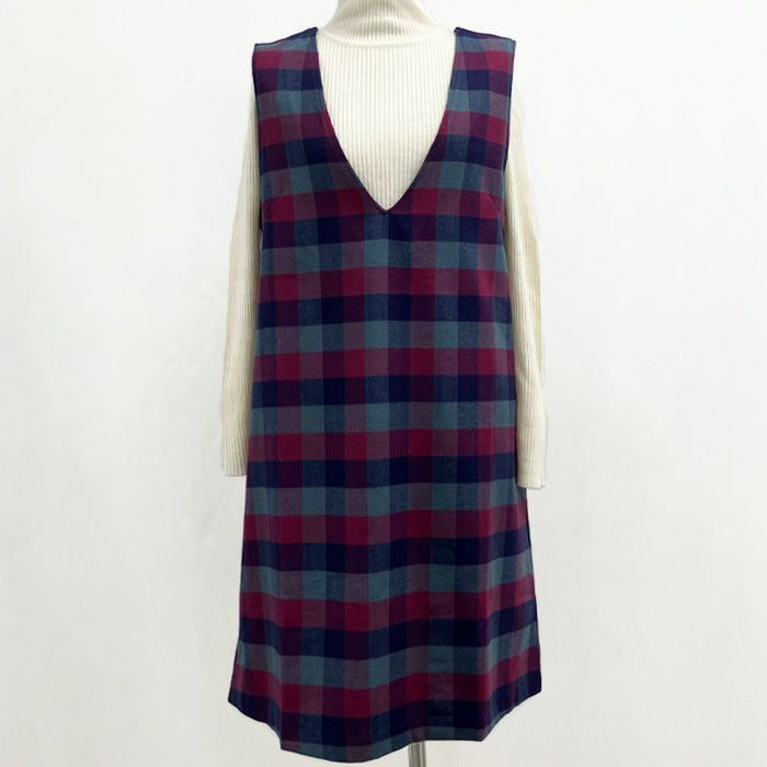 メランジュブロックをつかったVネックジャンパードレス。両面を起毛させ柔らかい肌触りの生地です。深めVネックのジャンパースカートはシンプルな着こなしがおすすめです。