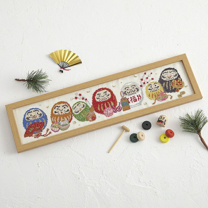 魔除けとしておなじみの『だるま』モチーフをカラフルにステッチ。ご利益が異なる7色のだるまに、別々の縁起物を組み合わせた楽しいデザインの夢や希望が叶う満願成就のフレームです。