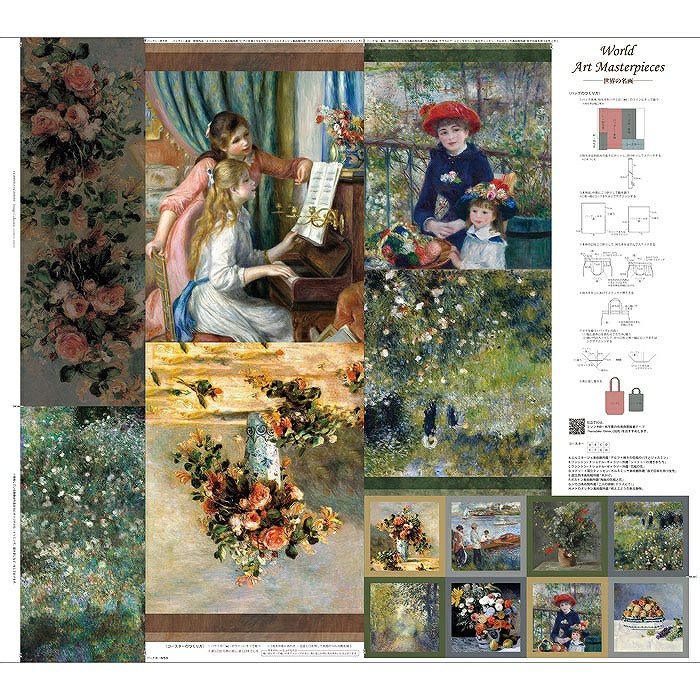 ルノワールが描いた花の作品中心に使用したパネル生地です。裁断して縫うだけで、バッグ2種と、コースター4枚がつくれます。