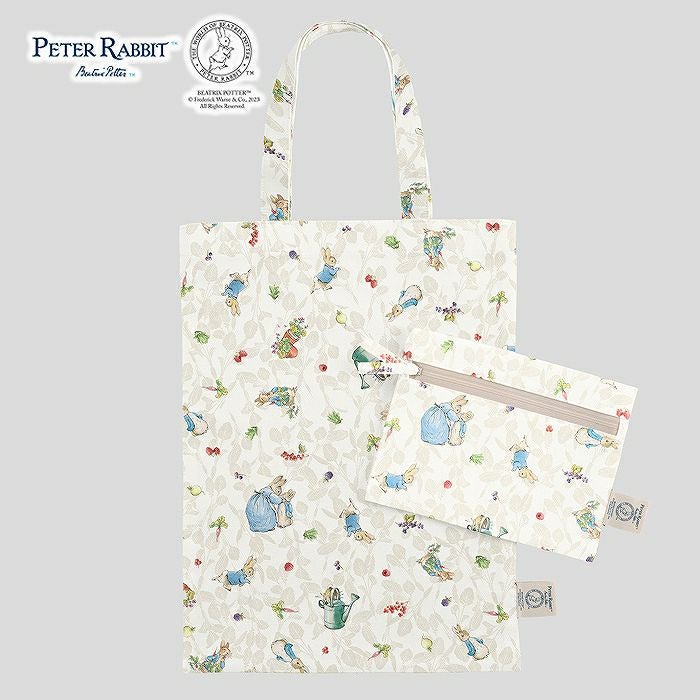 ピーターラビット™のおはなしがモチーフのラミネートのプリント地を使った、バッグ&ポーチセット。汚れがつきにくいよう表面がコーティングされています。直線縫いだけで完成します。