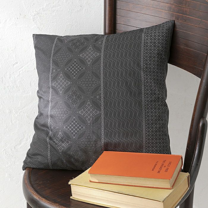 日本の古典柄・刺し子の柄を配置した生地を使用したクッションカバーのご提案。シックなグレー地の生地を使って、直線で縫うだけでお部屋の印象を変えられるアイテムがつくれます。