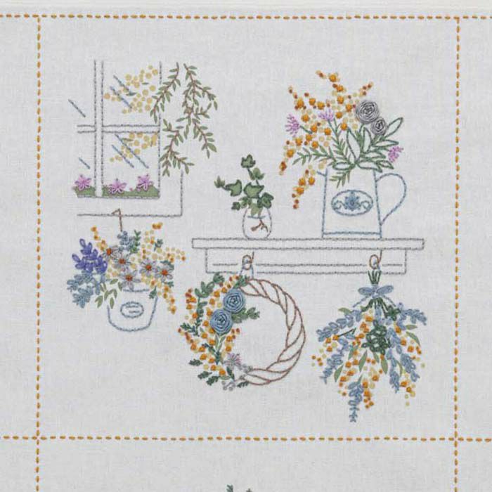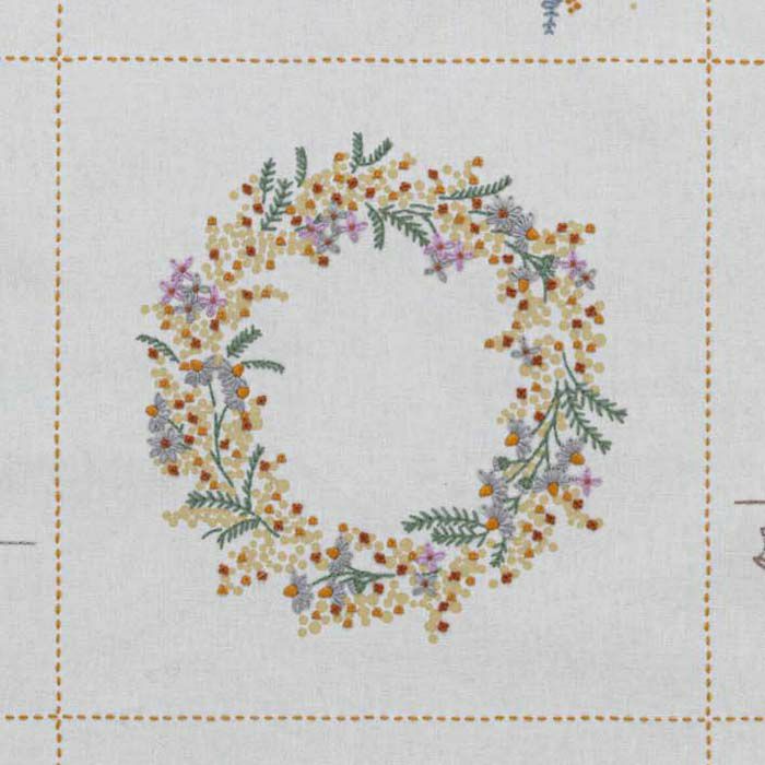 優しい黄色とグリーンの2色の色印刷入りクロスを、刺しゅうで仕上げます。5種のミモザリースと室内でミモザを飾って楽しむシーンを交互に組み合わせました。