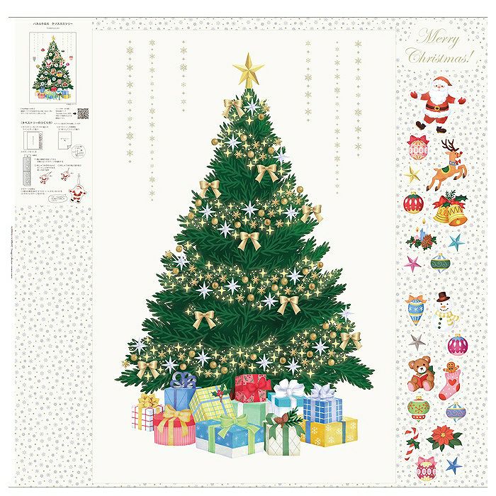 モチーフとツリーがプリントされたパネル生地と、ボタン、刺しゅう糸、接着芯の材料セットです。ボタンでお好みに飾り付け、簡単にタペストリーをつくることができます。