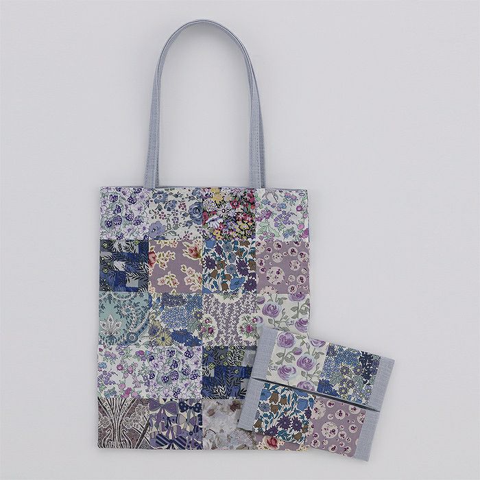 リバティプリントのミニスワッチボックスを使った、バッグとティッシュケースのセットアイテム。スラブコットンの持ち手と裏袋つきで、サブバッグやお散歩バッグにおすすめです。