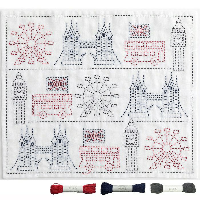 タワーブリッジ、ロンドン塔、ロンドン・アイなど、テムズ川周辺の有名建造物と二階建てバスを刺し子で。3色の刺し子糸でモチーフごとに糸を始末しながら刺し進めます。
