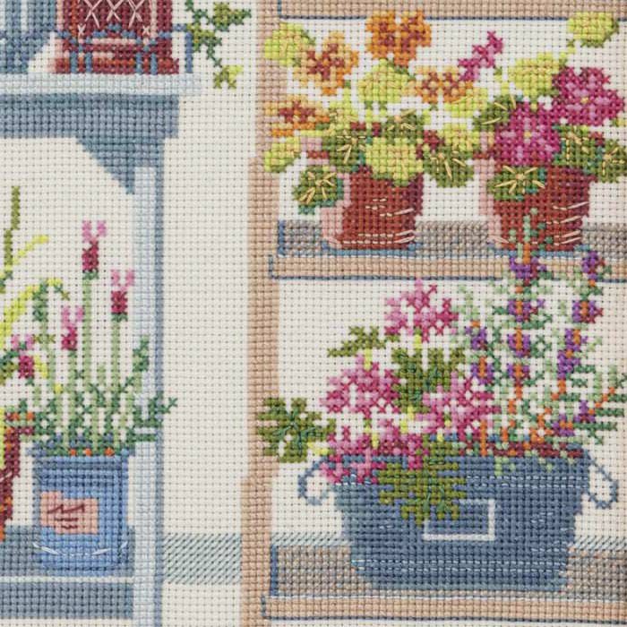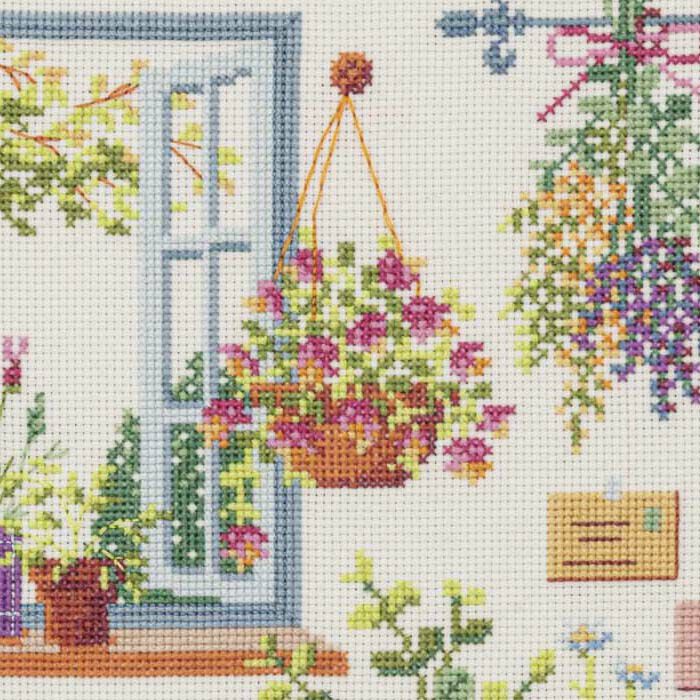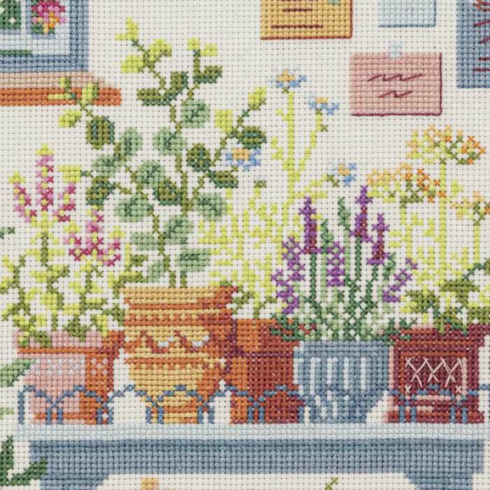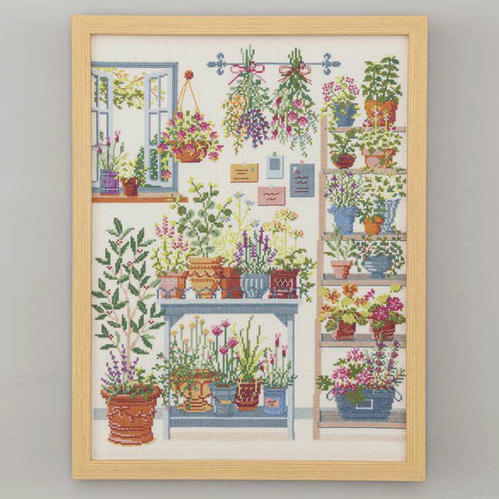 鉢植えやスワッグなどハーブのある暮らしをクロスステッチで丁寧に表現するキット。室内の一角に飾った、色とりどりのハーブ鉢が並んだシェルフや小窓が素敵なハーブライフをお届けします。ナチュラルな癒しの空間を演出する、インテリアに映えるフレームです。