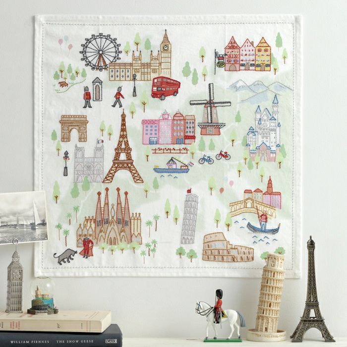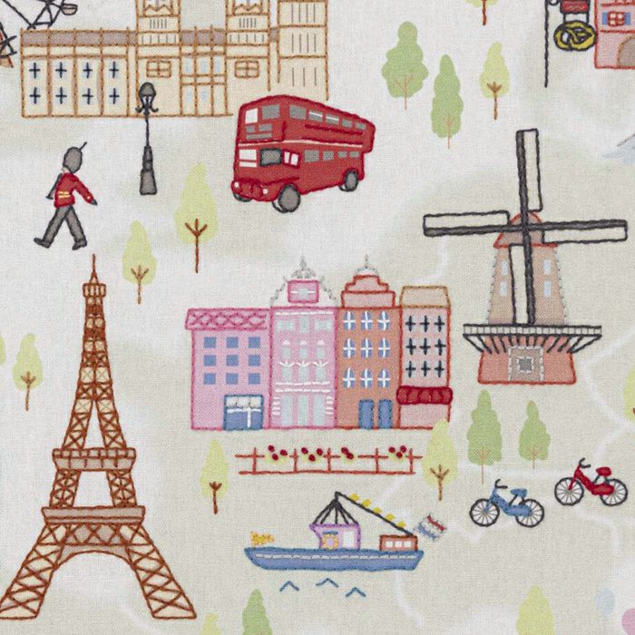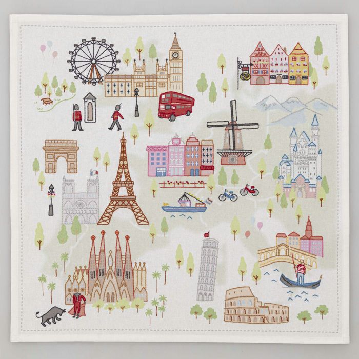 欧州の地図に6か国の名所を重ねた色印刷のクロスをシンプル刺しゅうで仕上げるデザインです。街歩きの思い出を刺しゅうでつづるイラストマップをつくるような楽しみのあるアイテム。