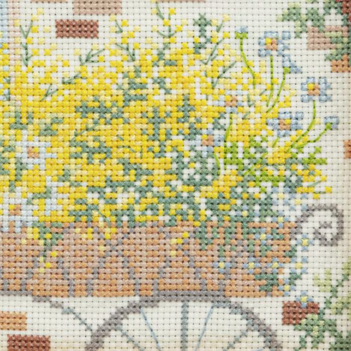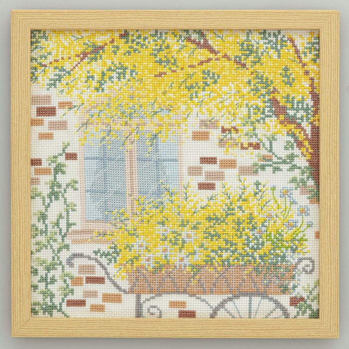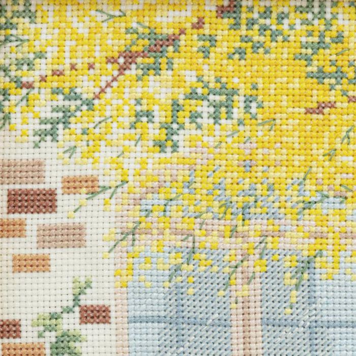 つる草の絡むレンガ壁とアーチ形窓の洋館の庭に、満開のミモザの木とアイアン製のガーデンワゴンに載せたたくさんのミモザが。憧れの春のシーンをクロスステッチで表現します。