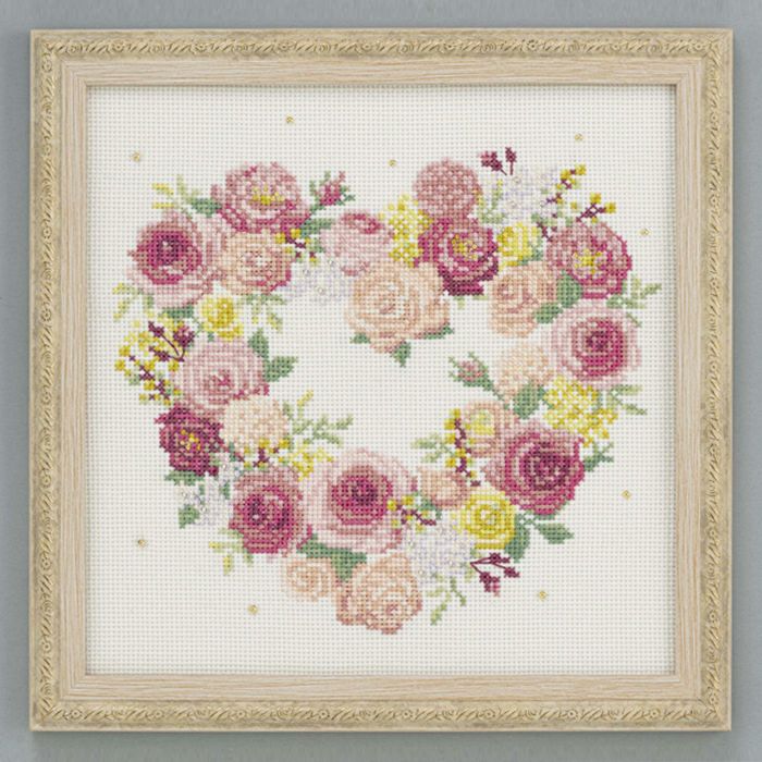 ピンクのバラが主役のハート型のリースをクロスステッチ。金のビーズをトッピングして華やかに仕上げます。おしゃれなレリーフフレームに入れ、シーズンを問わずに飾っていただけます。