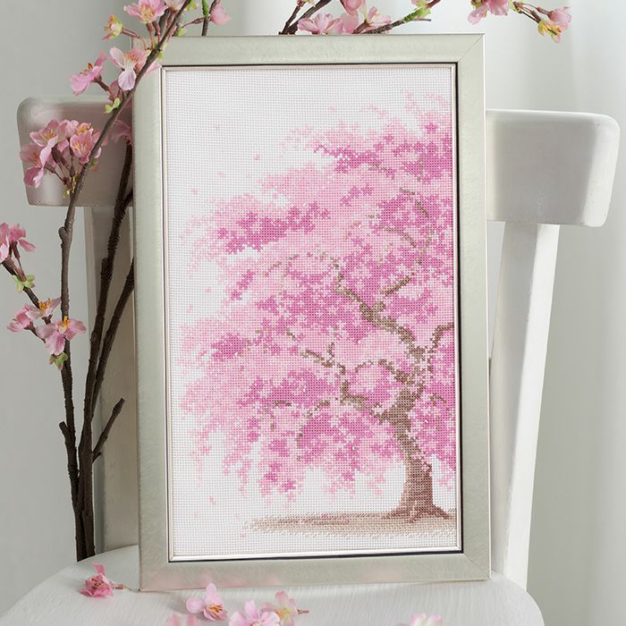 1本で凛と咲く満開のしだれ桜をクロスステッチで繊細に。薄紅色の花が咲きこぼれ、春風に舞い散る花びらも表現。今を盛りの桜を静かにながめる気分を味わえます。