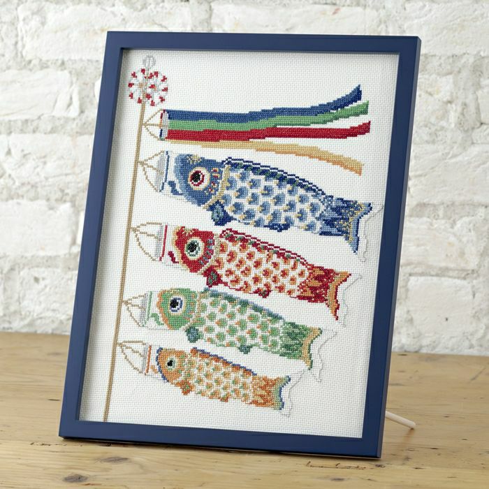 堂々と気持ち良さそうに泳ぐ大きな鯉幟をクロスステッチするフレーム。色とりどりの刺しゅう糸と金銀糸で、健やかな成長を願うシンボルをおおらかに表現します。
