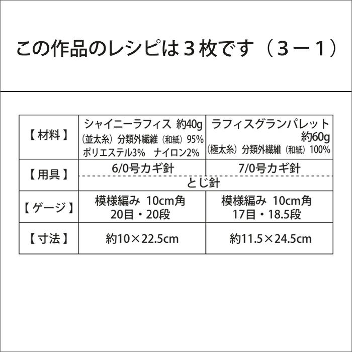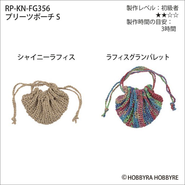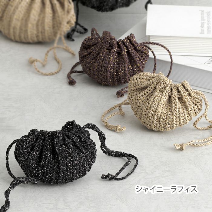 シャイニーラフィスまたは、ラフィスグランパレットで編む、夏にぴったりの小さなポーチのレシピ(作り方シート)です。プリーツ状に編んだ本体をきんちゃく形にはぎ合わせ、袋口にひもを通します。細々したものを入れて。
