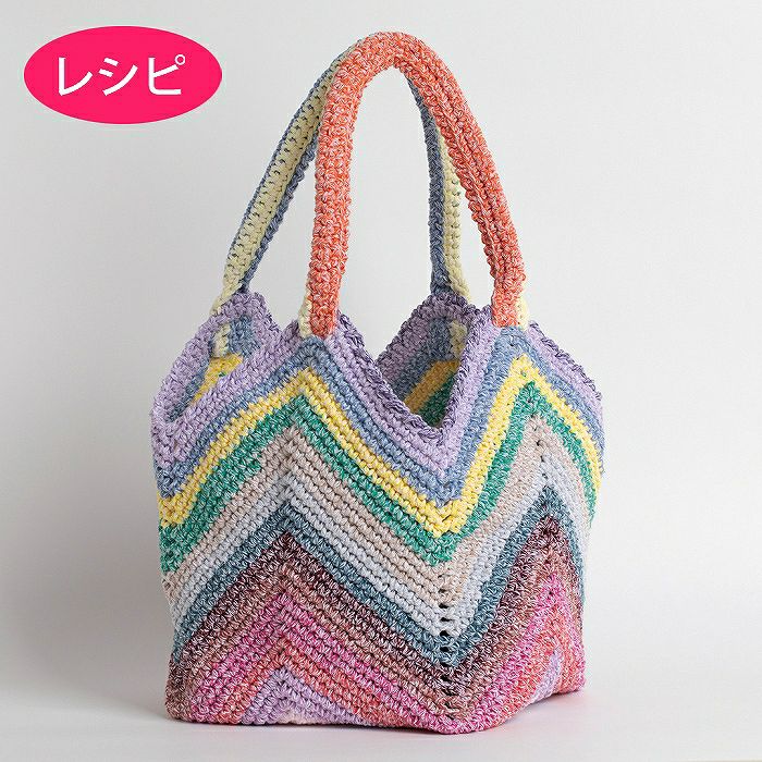 1かせに10色の糸がセットされた〈ツイストリース〉を2カセ使ったカラフルバッグのレシピ(つくり方シート)です。底からぐるぐる細編みで増減しながら編み進めていけば編み上がり。肩にかけて使うこともできます。