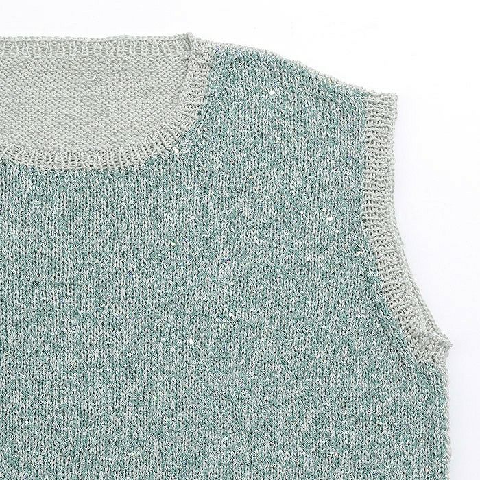 前身頃は極細コットン糸とスパンコール糸を引きそろえ、後ろ身頃は極細コットン糸のみで編む、メリヤス編みのシンプルベスト。ノースリーブでも重ね着でも楽しめる、スタイリッシュなアイテムです。