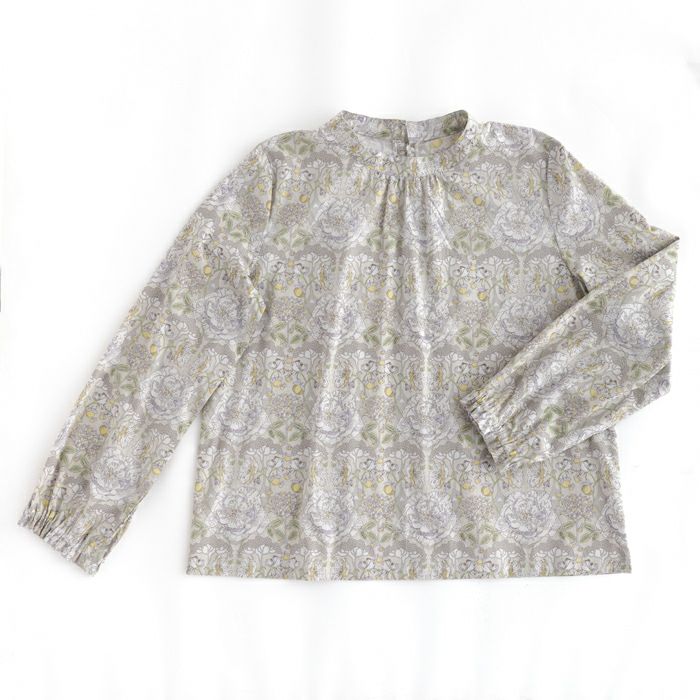 胸元にギャザーを寄せ、袖口はゴム仕様のふんわり優しいシルエットです。