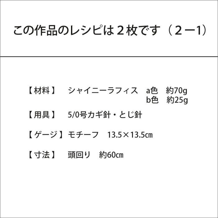 四角いモチーフ5枚を繋いだクラウンに縁編みをフリルのように編みつけた簡単クロッシェハットのレシピ(作り方シート)です。ラメ入りの〈シャイニーラフィス〉を使い、カジュアルな中におしゃれ感のある仕上がりに。