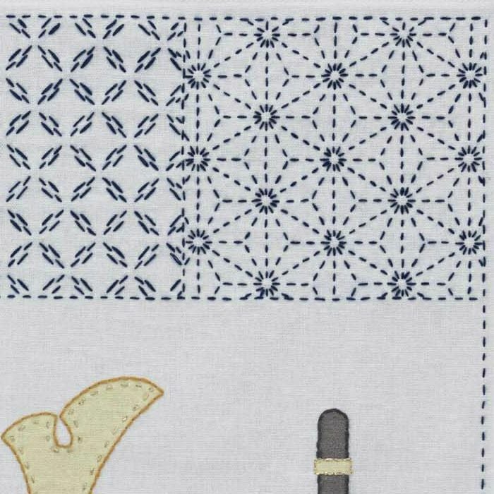 格調高い兜飾りと伝統柄の刺し子を組み合わせた、2種類のステッチが楽しめるステッチクロス。真ん中に兜、左右に魔除けの弓矢と太刀を並べた節句飾りは、色印刷に刺しゅうをプラスして仕上げます。