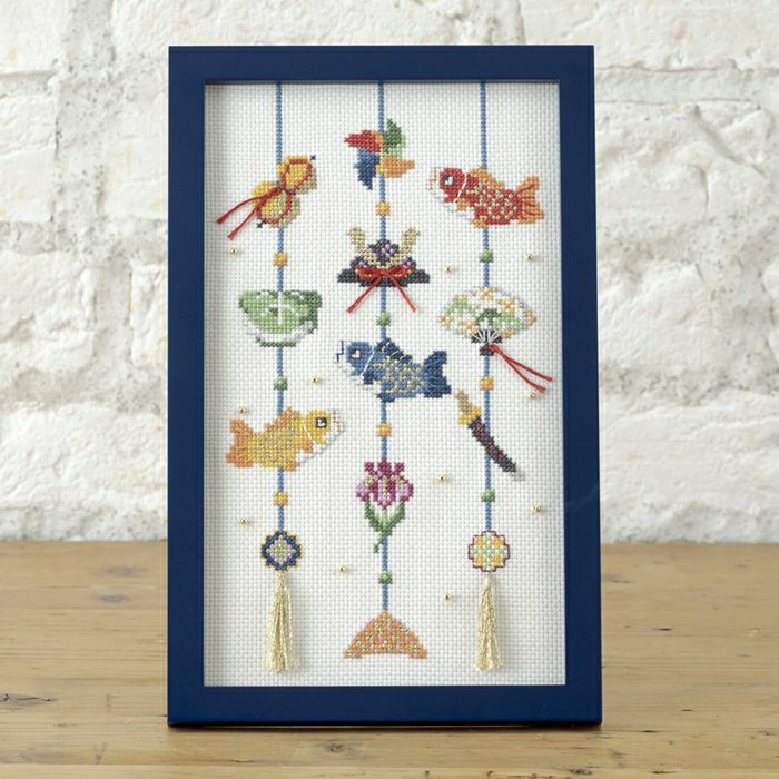 兜、鯉、扇、菖蒲など、お祝いモチーフをつるし飾りにしたデザインを、クロスステッチで細やかに表現。ビーズや刺しゅう糸、房飾りに金色のきらめきをプラスしました。