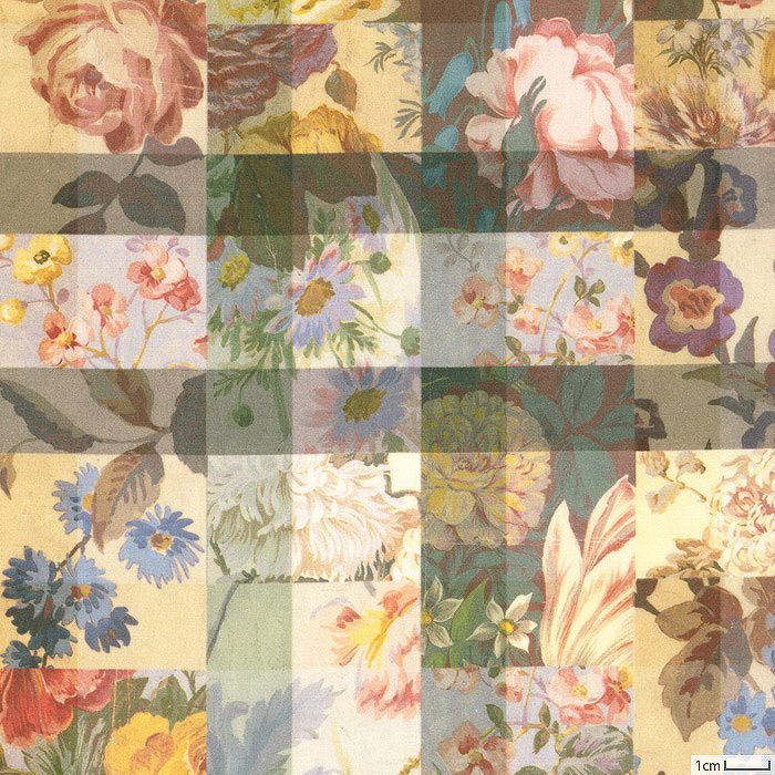 リバティのアーカイブに所蔵されているいくつかの手描き作品を繋ぎ合わせて作られたパッチワークの花柄は、チェック柄になるように慎重に構成されました。キク、バラ、チューリップ、デイジー、シャクヤク、クレマチスの花が格子から覗き、光と影の部分が独特の空間観を生み出しています。