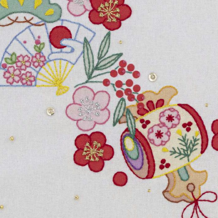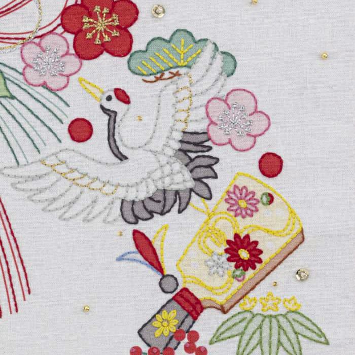 鶴亀、小づち、松竹梅など、新年に飾りたいモチーフをリース状に配置したおめでた尽くしのステッチクロス。色印刷に刺しゅうを加え、ビーズやスパンコールをトッピングして仕上げます。