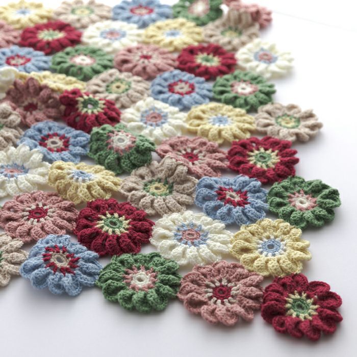 立春の頃から咲き始めるアネモネをイメージしたフラワーモチーフを、7色の糸で編みながらつないでいくカラフルなブランケット。インテリアのアクセントに。
