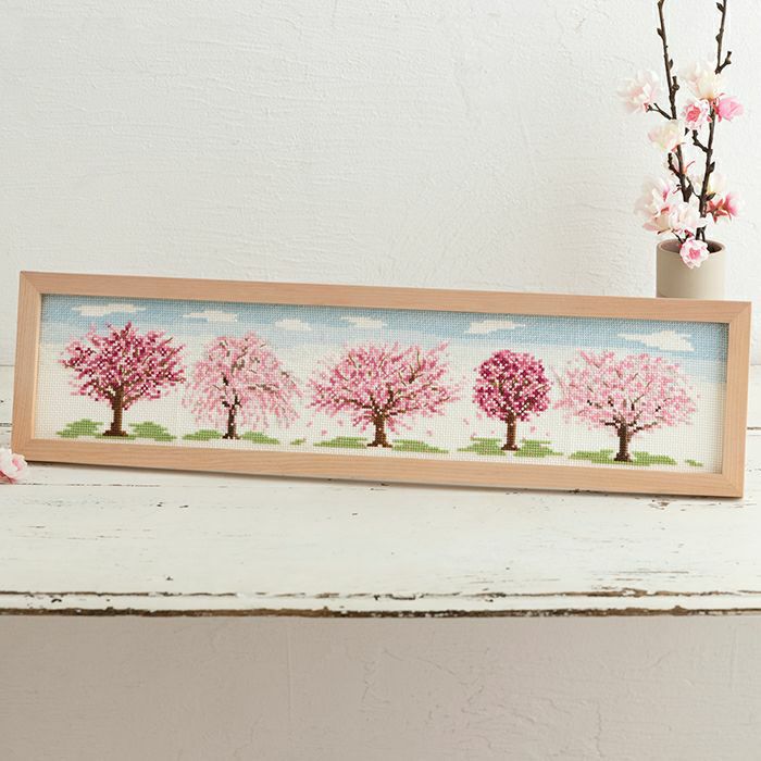 樹形の違う桜の木をクロスステッチしたフレーム。5種の桜を一枚の絵のように楽しめる贅沢なデザイン。