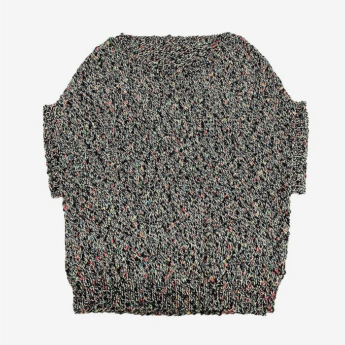 カラフルなスラブヤーン入りの〈コットンプリズム〉で編む、ドロップショルダーのベスト。春は重ね着しやすいベスト、初夏はフレンチスリーブ風ニットとして、長く楽しめるアイテムです。