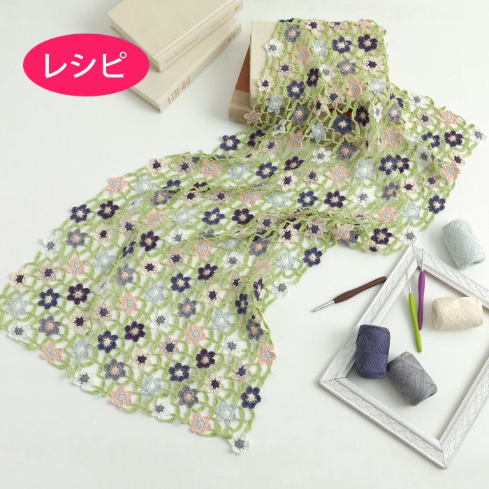 極細コットン糸9色で編む、花畑のようなモチーフつなぎのブランケットのレシピ(つくり方シート)です。編みためた花モチーフを葉っぱモチーフで編みつなぎます。ソファーカバーやスプレッドなど用途はお好みで。