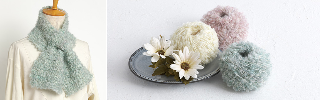 モヘヤとウールをミックスして3色にかすり染めをし、ループ状に仕上げました。軽やかで柔らかい風合いが特徴です。
