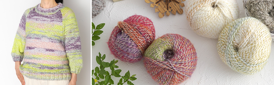 毛玉になりにくい加工が施されたウールとアクリルの混紡糸をショートピッチに絣染めした糸と、ブークレタイプの綿糸を組み合わせた手編み糸です。