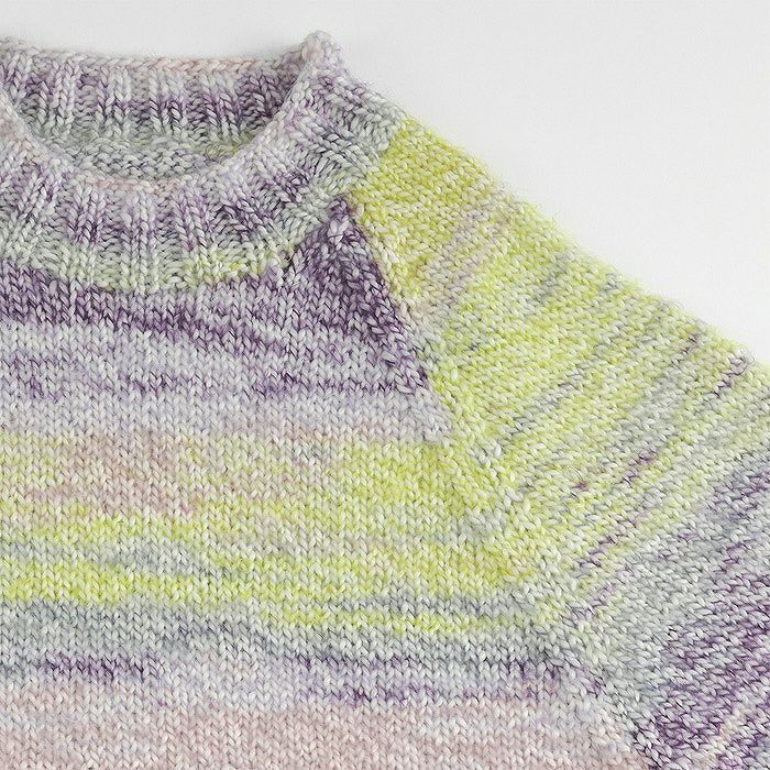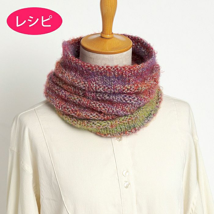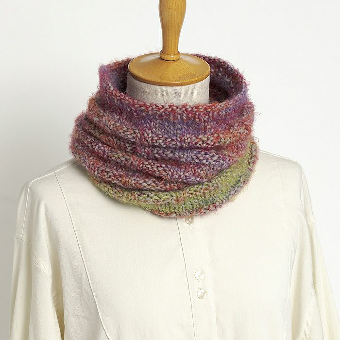 毛玉になりにくい加工が施されたウールとアクリルの混紡糸をショートピッチに絣染めした糸と、ブークレタイプの綿糸を組み合わせた手編み糸です。