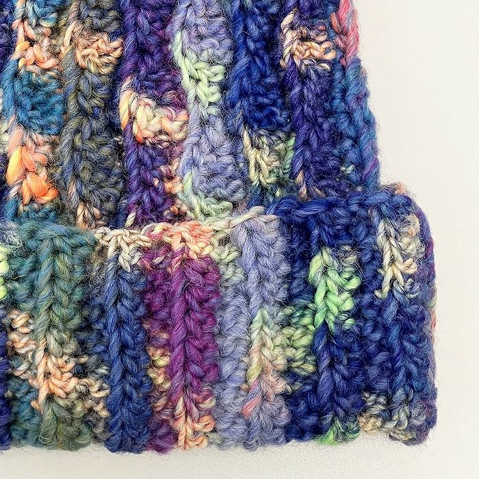 うね編みならではの立体的でぽこぽことした編地がかわいいニットキャップ。カラフルなネオンカラーの段染め糸が織りなす自然なグラデーションが冬のコーディネートに彩りを添えます。