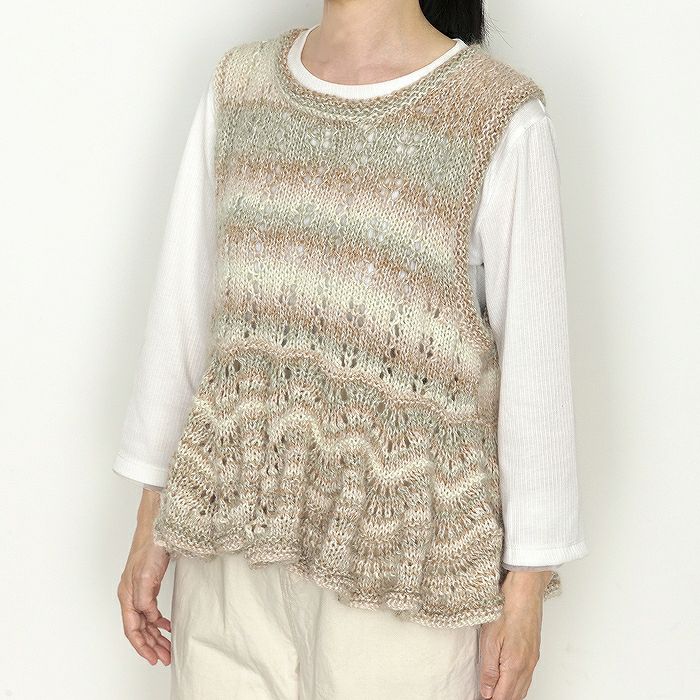 淡く移ろうグラデーションに染め上げたシルクとウールの混紡糸に、シルケットコットン、モヘヤ糸、ラメ糸を添えて、奥行きのあるふんわりとした彩りに仕上げました。