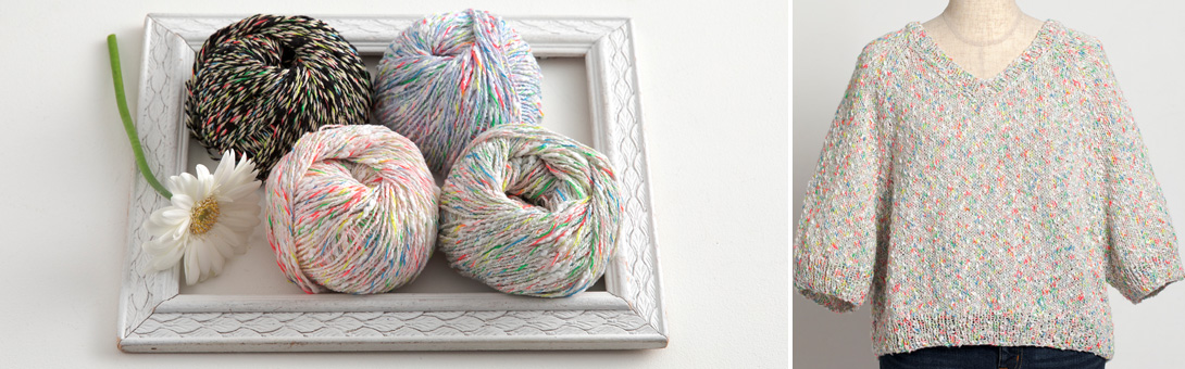 強弱のあるスラブ糸とカラフルなスラブ糸を撚り合わせ、さらに、弱伸縮性のある軽さと柔らかさのある糸を撚り合わせた手編み糸です。 さらっとした感触とカラフルでプリズム感が楽しい、初心者の方にも編みやすい糸に仕上げました。棒針でざっくり編んだり、かぎ針で編む小物にもおすすめです。