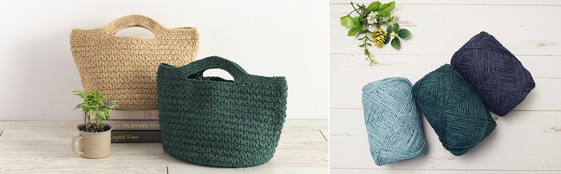 〈パピエドゥ〉は綿と和紙の糸を合わせてブークレ状に撚糸した糸。マットな色目と柔らかく編みやすい質感が特徴です。かぎ針で編む小物作りにおすすめ。
