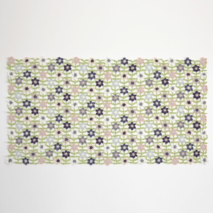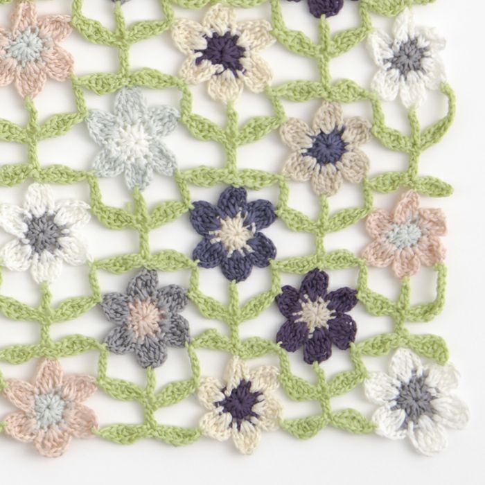 極細コットン糸9色で編む、花畑のようなモチーフつなぎのブランケット。編みためた花モチーフを葉っぱモチーフで編みつなぎます。ソファーカバーやスプレッドなど用途はお好みで。