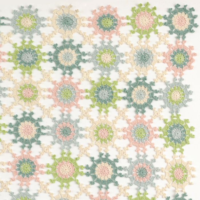 極細のコットン糸で編むモチーフつなぎのブランケット。さわやかな5色を細かく替えながら、最終段のピコットでつないでいきます。ショールやひざ掛け、インテリア小物にもおすすめ。