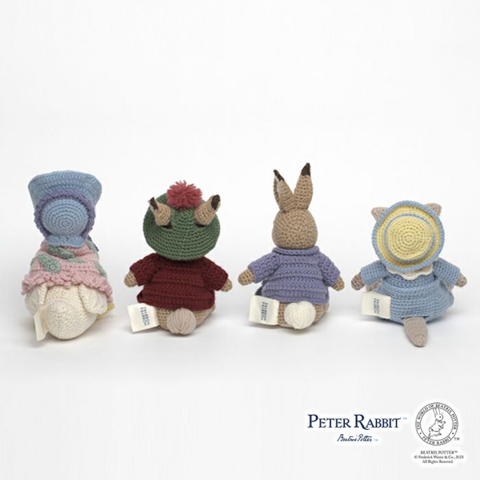 細編みメインで編み上げる4体セットの編みぐるみ。ベンジャミン・バニー™、あひるのジマイマ™、こねこのトム™は、それぞれ絵本シリーズの主役としても登場する人気者たちです。