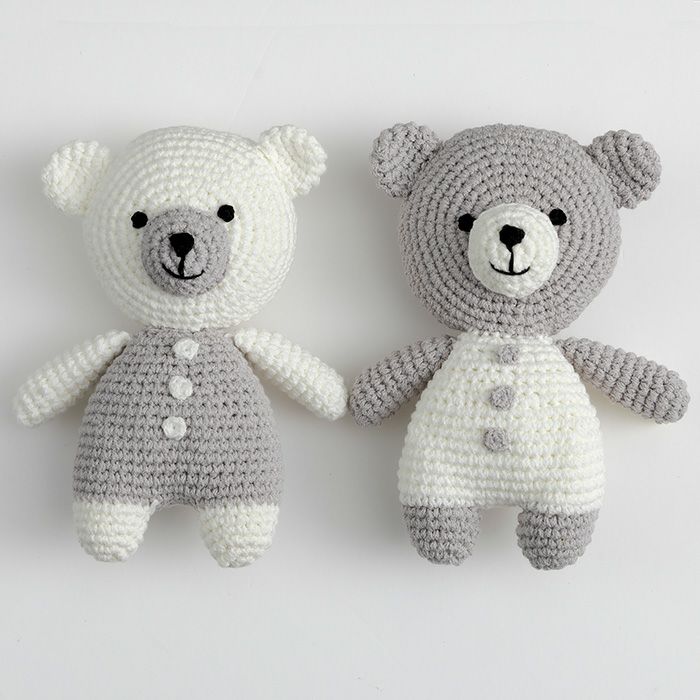 本体を2色のオーガニックコットンで編む、ペアの編みぐるみ。別編みの頭と腕は、丈夫にとじつけて。赤ちゃんが遊びやすい平らなフォルムが可愛いファーストトイです。