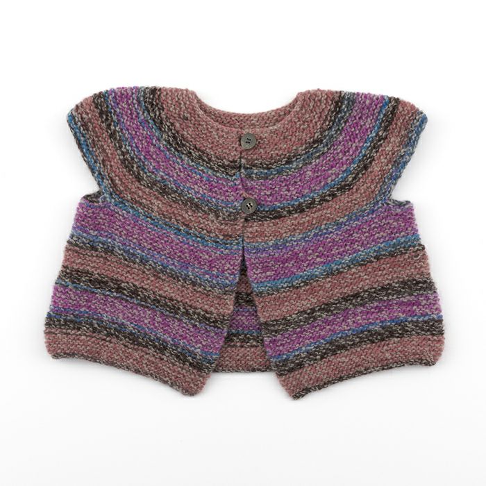 パーツのとじはぎなしで一気に編み上がる、軽くて暖かいガーター編みのベスト。かわいい丸ヨークは、腕の出し入れが簡単。活動的なキッズの冬のお出かけに。