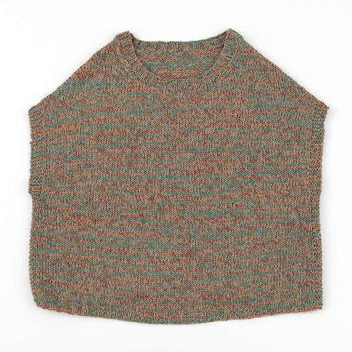 ノースリーブやベストとして3シーズン着回せるメリヤス編みのシンプルなアイテム。袖ぐり付きの身頃を2枚編み、前後をつなぐだけ。ミックス感とメタリック模様が美しい夏糸を使います。